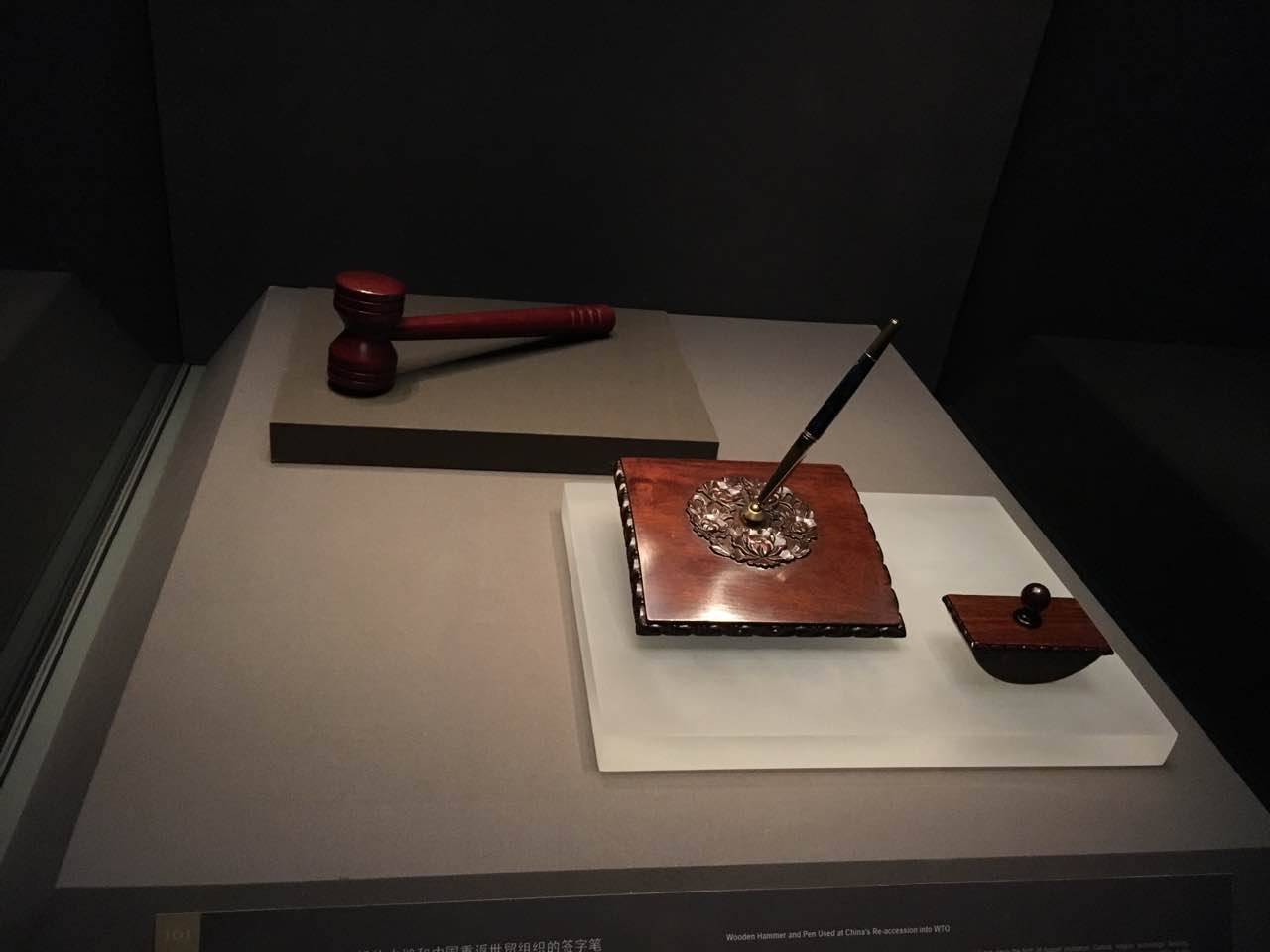 为了体现巡展地与展览本身更强的互动性和契合度,该展览的策展方式也颇为新颖,即在每个巡展地区,合作举办方都要为这部世界史增添一件能够代表社会当下进程的物品,这也就是展览现场的“第101件(套)展品”,它将展览的触角由过去、现在延伸至对将来的思考。而此次在中国展出,中国国家博物馆也照例挑选了一套具有特殊意义的展品——“2001年宣布中国重返世贸组织(WTO)的木槌和中国重返世贸组织的签字笔”,这在体现中国时代特征的同时,也在回应着展览的主旨即“全球化是人类内在需求”。