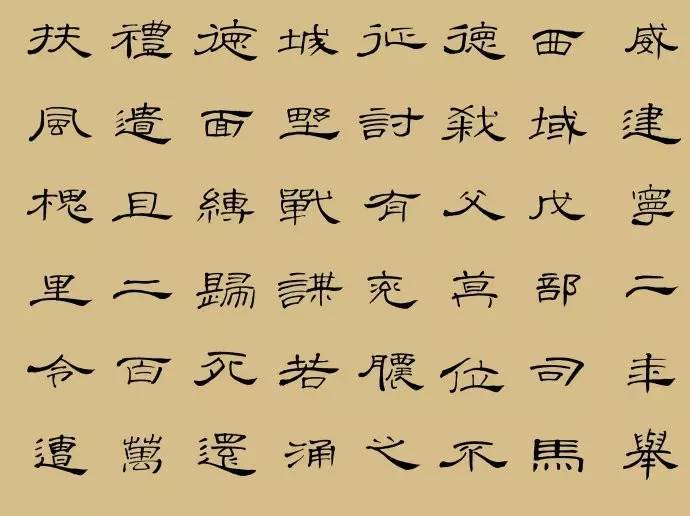 隶书是将小篆的书体去其繁复、增减其体而创立,结体更为端正整齐,呈秀丽端庄之美。其用笔,以汉隶为例,主要是横画的变化,蚕头雁尾,一波三折,尽情地舒展,呈委婉波状之势。如果篆书是以弧笔著称,那么隶书则是以波势见长。
