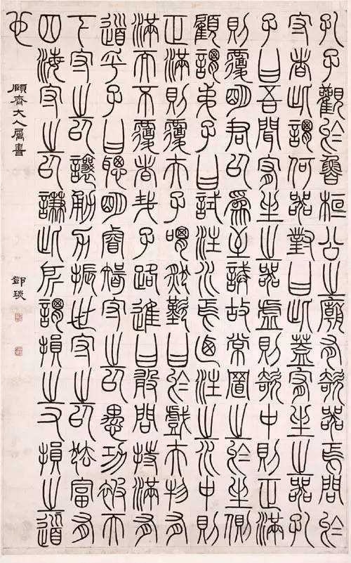 篆书有大小篆之分,其书写的方法大致一样,主要是有其文字繁简的差别。大篆较繁,小篆较简,其书体的结构也由茂密变得较为疏朗。结体上,大篆接近于甲骨文,结体错落有致,呈自然质朴之美。其用笔纯用中锋,用力匀平,流转自如。小篆的结构是以大篆演变而来,其结体较大篆更为工整齐律,呈匀称整饰之美。其用笔不但纯用中锋,而且笔势更为圆转流畅,显得朴茂端重。