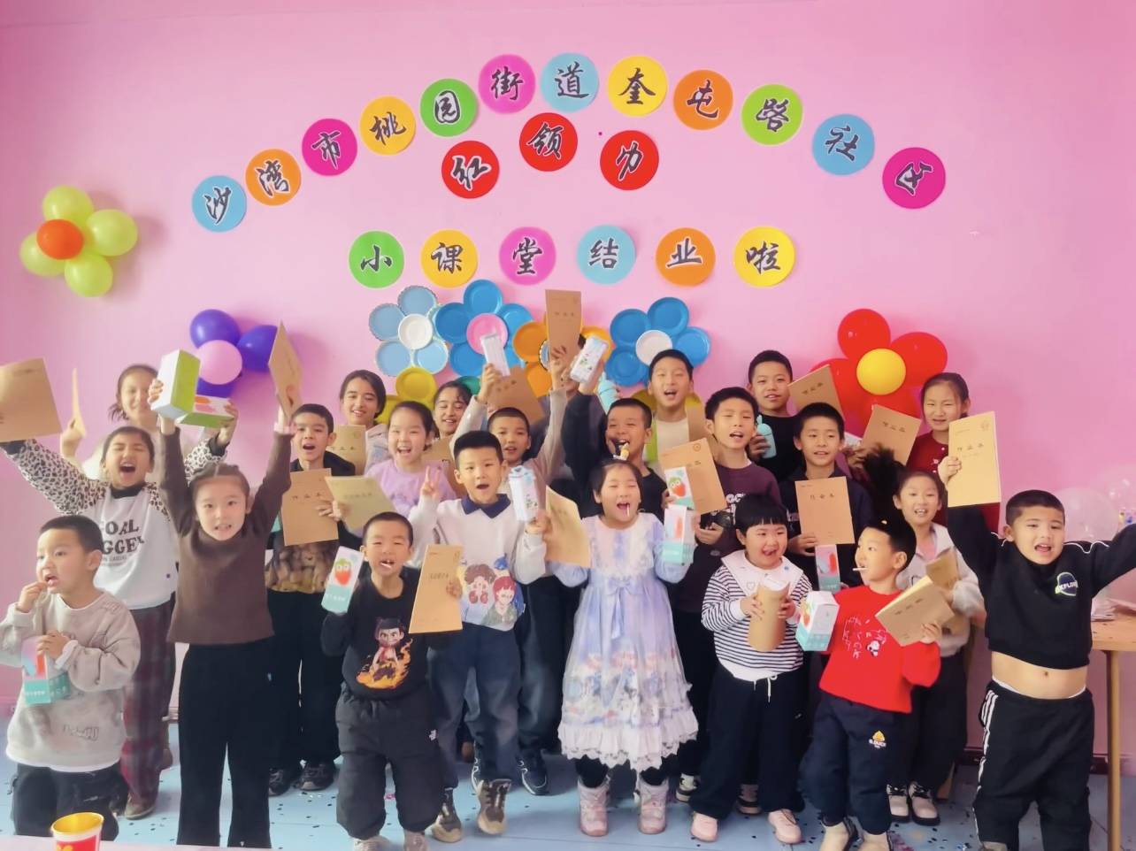 活动现场被气球、风车和彩色标语装点得温馨又热闹。孩子们在品尝零食的同时,参与了激动人心的抽奖环节,一个个脸上都洋溢着幸福的笑容。社区志愿者为孩子们颁发了精心准备的结业证书和文具、水杯等礼品,鼓励他们在新的学期里继续努力学习、快乐成长。在轻松愉快的氛围中,大家一起回顾了假期里在小课堂中的收获与美好瞬间,为这段充实的假期时光画上了圆满的句号。