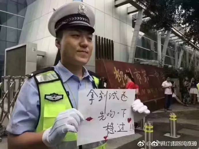 今天广西各地高考如火如荼进行,朋友圈看到这样一张照片,图文说明是柳州护考交警创意祝福:拿到试卷先吻一下,稳过!此举赢得大家纷纷点赞[赞]……不禁感叹,柳州交警真会玩[哈哈](@广西电台私家车930)