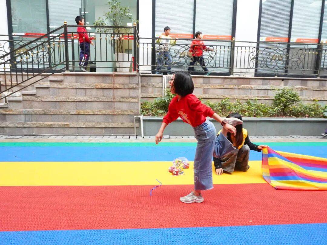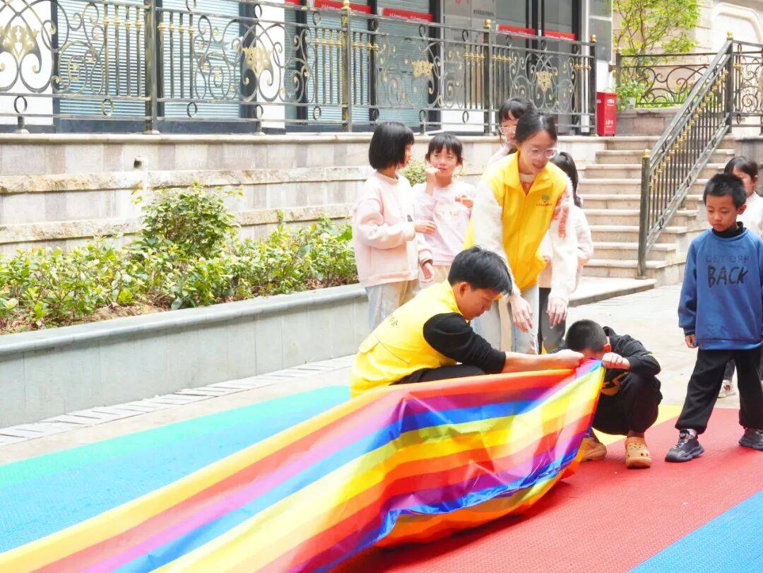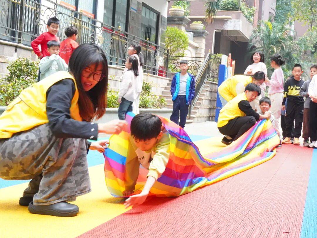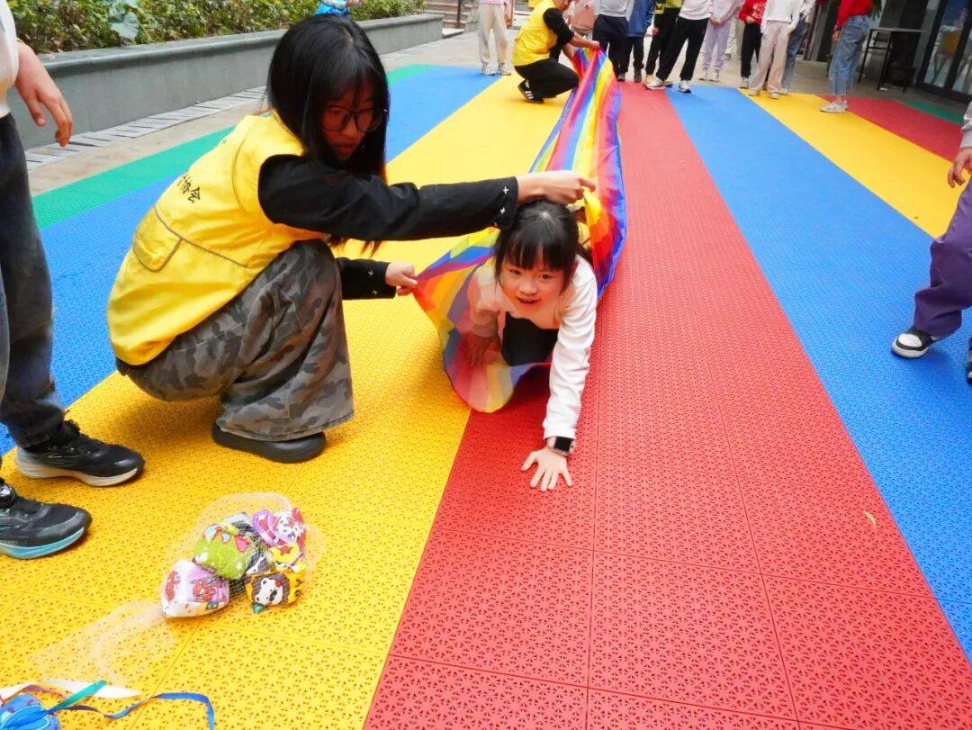 活动正式开始后,孩子们热情高涨、精神饱满,个个跃跃欲试。接力过程中,大家严格遵守规则、有序排队、依次接力,展现出良好的纪律意识与集体观念。穿越彩虹长筒套时,孩子们认真专注、稳步前行;投掷绣球时,大家凝神瞄准、全力以赴,努力为小组争取更好成绩;每当一名队员完成任务折返击掌,队友们都会齐声加油、热烈鼓掌,现场呐喊声、欢笑声此起彼伏。面对挑战,孩子们不畏困难、积极尝试,相互鼓励、彼此支持,充分展现了团结协作、奋勇争先、永不气馁的良好精神风貌。大学生志愿者全程细心守护、温柔引导,及时为孩子们加油打气,耐心协助完成每一个环节,用温暖的陪伴与专业的服务,为活动顺利开展保驾护航。