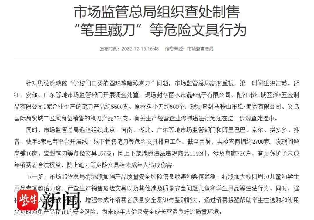 同年12月,市场监管总局就相关问题发布消息称,已第一时间组织多地市场监管部门开展调查处置,现场封存2家企业生产的笔刀产品约5600支、原材料小刀约500个;现场查封某公司、某商位销售的笔刀产品756支。同时,市场监管总局迅速组织多地市场监管部门和5家电商平台开展线上线下销售笔刀等危险文具排查工作。