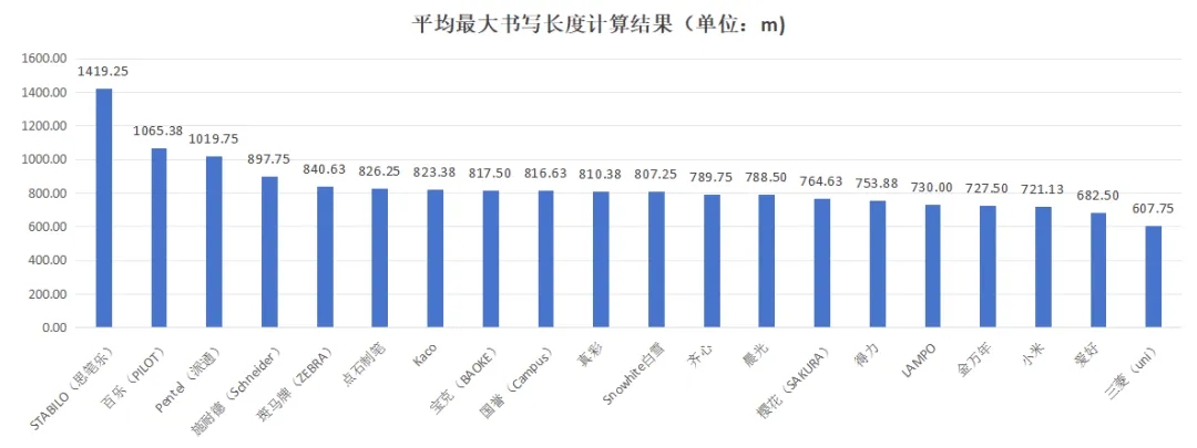 结果显示:20款中性笔在书写测试时,直至墨水用尽未出现线迹断线、变淡等书写异常的情况。平均最大书写长度在607.75米~1419.25米之间,数值越大,表现越好。